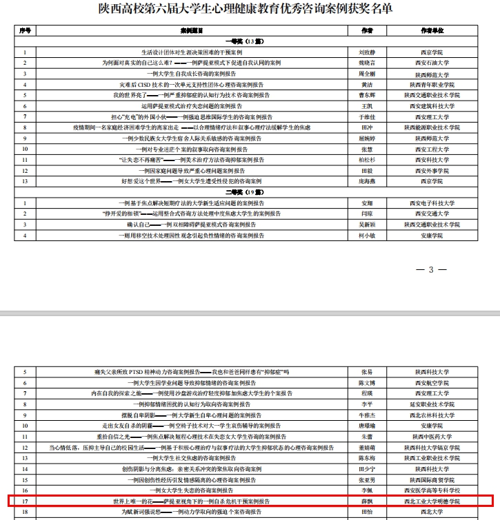 2020年5月至7月,省教工委实施了第五届“阳光护航”心理教育育人宣传季实践活动,期间开展了陕西高校第六届大学生心理健康教育优秀咨询案例和优秀教案评选。通识教育学院心理健康教育教师薛飘提交的题为《世界上唯一的花——萨提亚视角下的一例自杀危机干预》案例,在全省61篇优秀咨询案例中,荣获陕西省二等奖;提交的《精诚所至愿同舟——大学生的人际交往》教案,在陕西高校第二届心理健康教育优秀教案评选中,荣获陕西省三等奖。