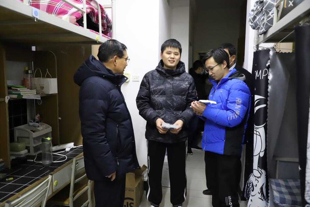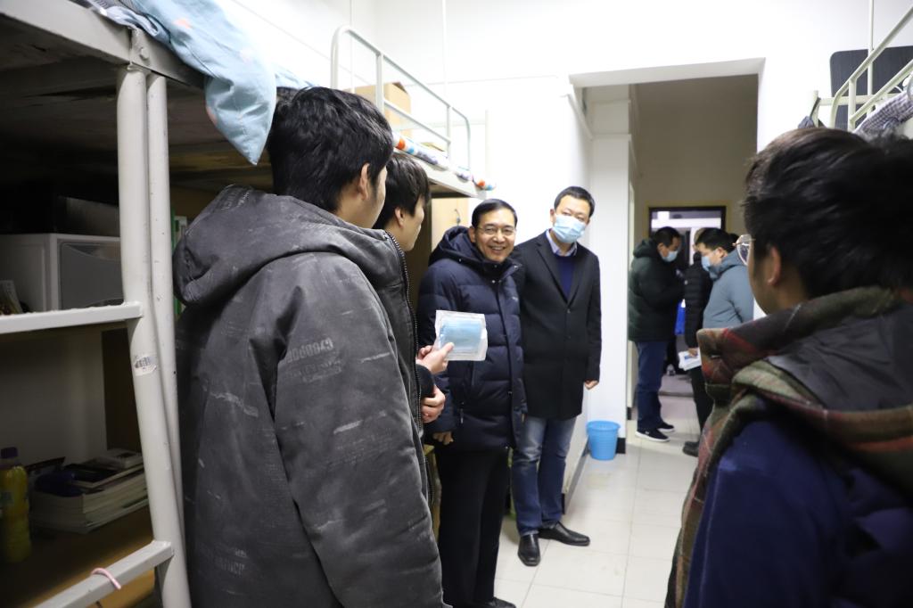 1月9日晚,学校校长杨健君带领校领导和值班人员走访了学生宿舍,看望尚未离校同学,向他们提前送上新春祝福并发放卫生防疫用品。