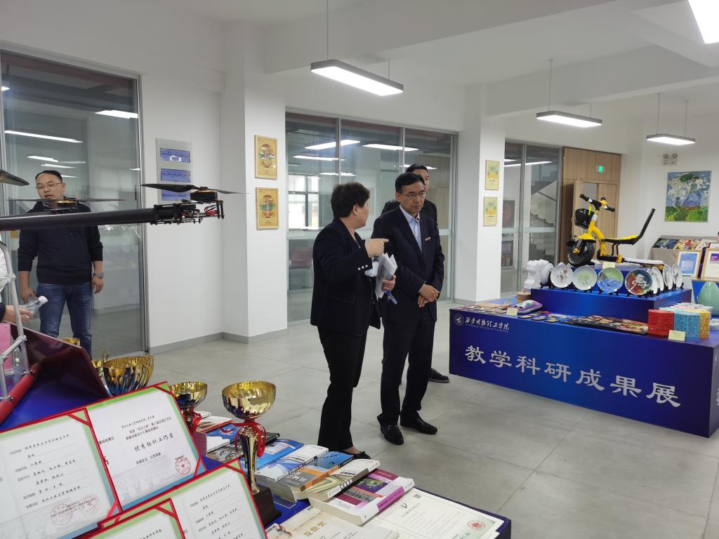 杨校长一行首先来到明心楼教学成果展室,仔细的查看了各院展示的展品,对成果展室展出的教师、学生成果予以肯定,同时对成果展板内容提出了完善意见。