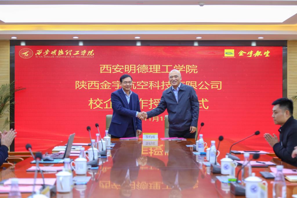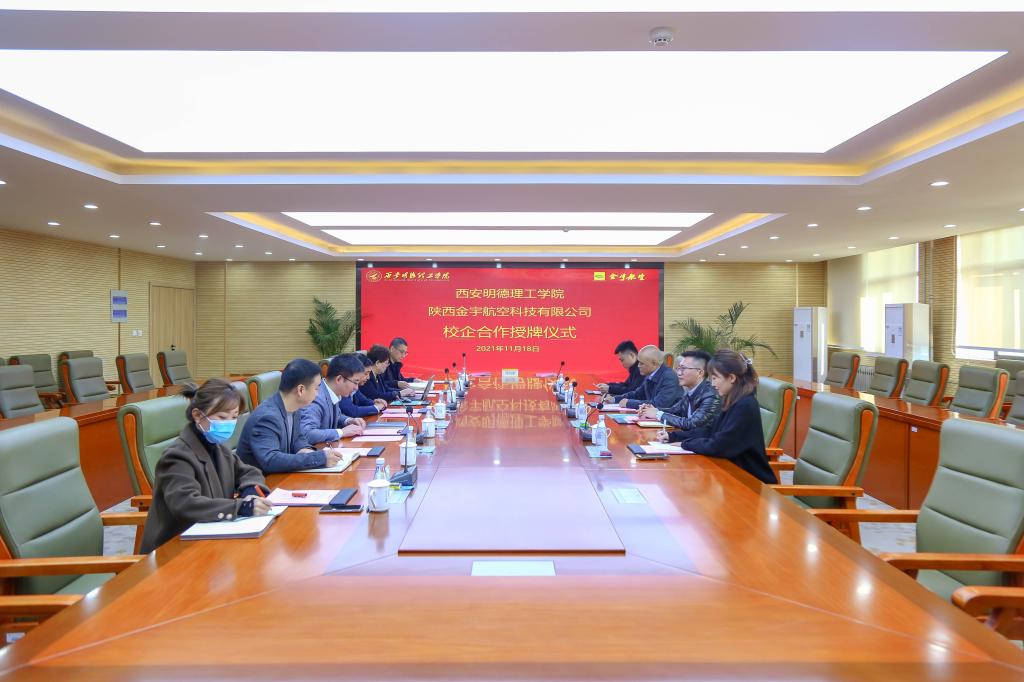 11月18日上午,beat365与陕西金宇航空科技有限公司在明志楼第一会议室举行合作签约暨揭牌仪式。校长杨健君、“金宇”董事长丁捷签署协议并授牌,副校长刘星主持仪式,学校董事长助理兼副校长庾鲜海、教务科研部部长朱延波、高等职业技术学院副院长王庭良,金宇公司市场总监冉磊、质量总监李勇、培训中心经理杨梦妮等出席授牌仪式。