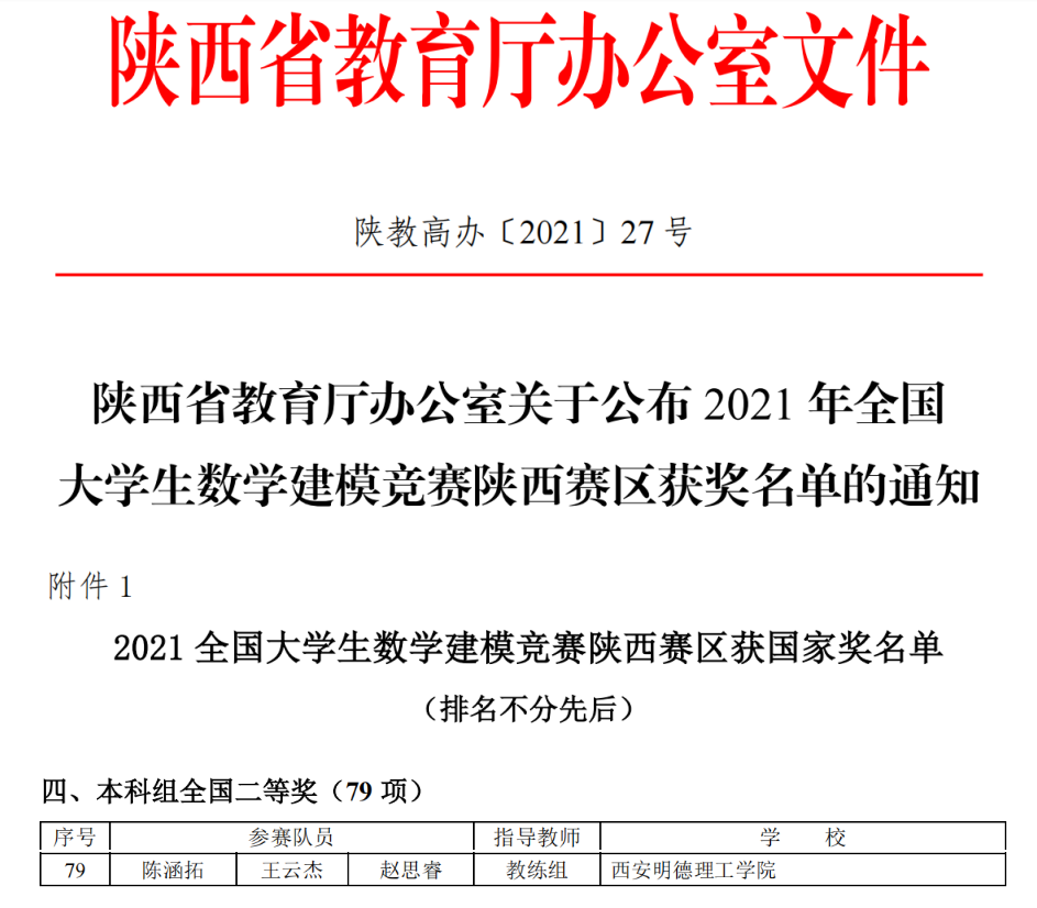 近日,2021年高教社杯全国大学生数学建模竞赛(CUMCM)成绩揭晓。学校共有42支本科组队伍、8支专科组队伍参赛,最终斩获本科组全国二等奖1项,陕西省一等奖13项,陕西省二等奖20项;专科组陕西省一等奖4项,陕西省二等奖4项。同时,beat365蝉联陕西赛区优秀组织奖。