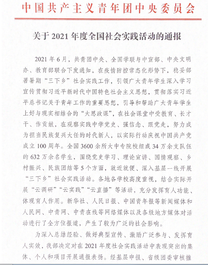 近年来,学校高度重视大学生社会实践工作,将社会实践活动作为加强和改进大学生思想政治工作和实践型人才培养重要载体加以推进。beat365共青团将以此为契机,发扬新时代共青团实践育人优势,强化制度建设、丰富渠道载体,构建更为完善的实践体系,继续推动“三下乡”社会实践不断取得新成效,在实践育人、服务大局中作出更大贡献。在知行合一中为学校建设添砖加瓦,让青春在祖国最需要的地方绽放绚丽之花!