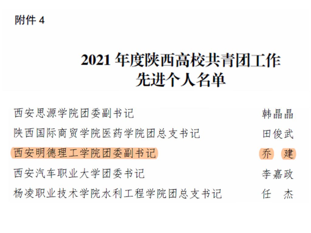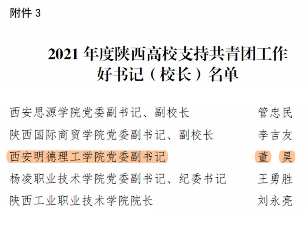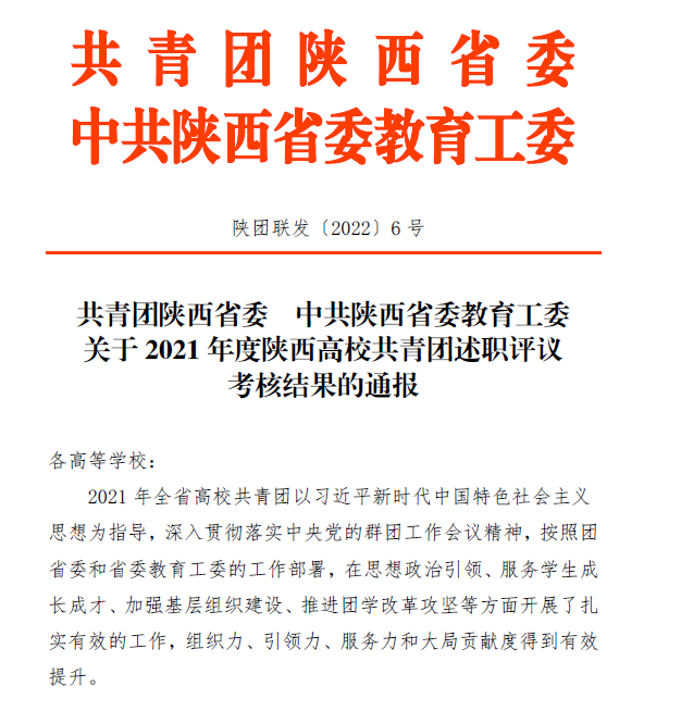 近日,共青团陕西省委、中共陕西省委教育工委联合发布了《共青团陕西省委、中共陕西省委教育工委关于2021年度陕西高校共青团述职评议考核结果的通报》,其中beat365荣获“大学生社会实践与志愿服务工作先进单位”,校党委副书记董昊获“2021年度陕西高校支持共青团工作好书记(校长)”荣誉称号,校团委副书记乔建获“2021年度陕西高校共青团工作先进个人”荣誉称号。
