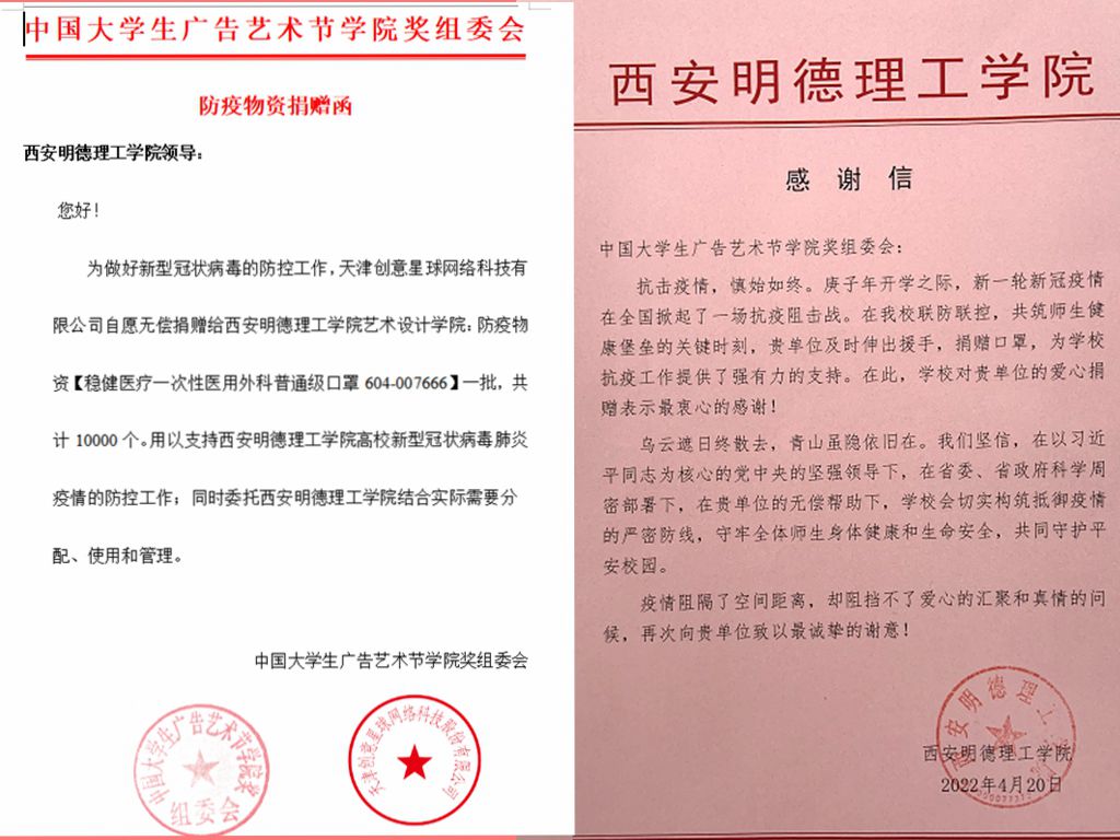 在学校联防联控的关键时刻,中国大学生广告艺术节学院奖组委会及时伸出援手,自愿无偿向学校爱心捐赠口罩10000件,为学校抗疫工作提供了强有力的支持。