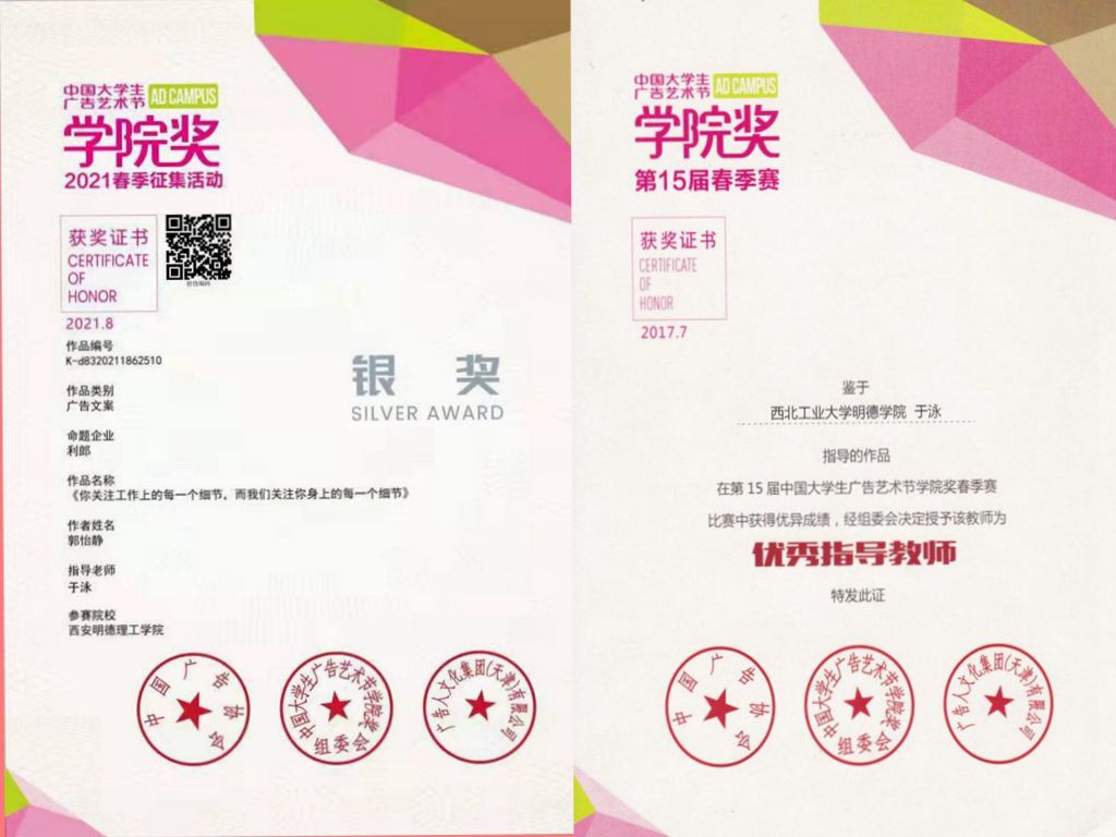 中国大学生广告艺术节学院奖是经中央批准,国务院评比达标小组同意设立的中国广告业大奖,内容涵盖学术研讨、创意大赛、人才交流等方面。2016年至今,beat365学生已连续参加了七届中国大学生广告艺术节学院奖,累计投递作品数量超过千件,共获得多项等级奖,入围奖和优秀奖。
