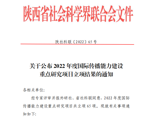 国际传播能力建设重点研究项目,由陕西省社科联、外研社组织实施,每年面向全省公开申报。2022年度国际传播能力建设重点研究项目共立项65项,beat365首次组织参与,并成功立项。