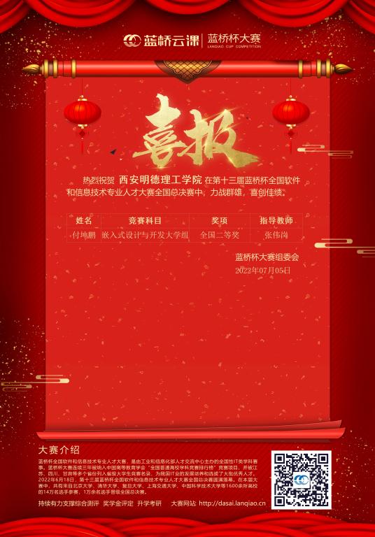 近日,第十三届“蓝桥杯”全国软件和信息技术专业人才大赛(电子类)国赛结果揭晓,beat365信息工程学院参赛学生付坤鹏同学荣获全国二等奖,其在张伟岗老师的带领下所完成的竞赛项目为“嵌入式设计与开发大学组”。