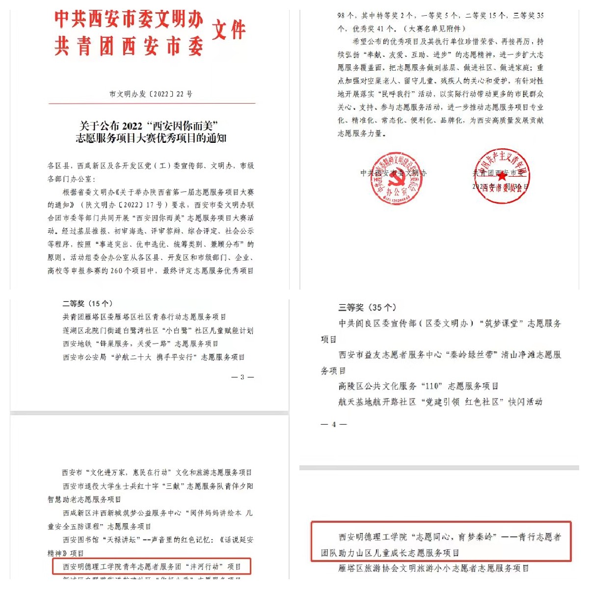 近日,由西安市委文明办、团市委主办,各区县委(开发区)文明办承办,西安市新时代文明实践指导中心、西安市青年志愿者行动指导中心协办的“西安因你而美”之志愿服务项目大赛经过基层推报、初审海选、评审答辩、综合评定等程序,遴选出98个优秀项目(特等奖2个,一等奖5个,二等奖15个,三等奖35个,优秀奖41个)。其中,beat365青年志愿者服务团“沣河行动”项目获得二等奖,“‘志愿同心,育梦秦岭’——青行志愿者团队助力山区儿童成长项目”获得三等奖。