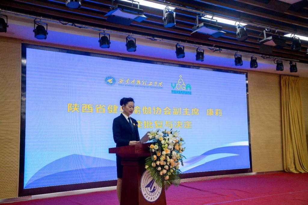 陕西省健身瑜伽协会副主席康莉宣读《关于同意成立陕西省健身瑜伽协会裁判员委员会的批复》与《关于聘任陕西省健身瑜伽协会第一届裁判员委员会委员的决定》,并解读了用人原则与工作原则。