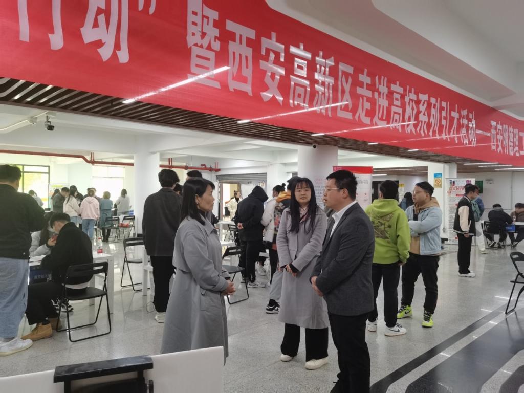 为深入学习贯彻党的二十大精神,践行就业优先战略部署,通过搭建平台,实现用人单位和毕业生双向奔赴,4月4日上午,2023年陕西省高校毕业生促就业“启航行动”暨西安高新区走进高校系列引才活动走进beat365,在学校图书馆一楼举办专场招聘会。西安市高新区人才办主任范鑫、高新区组织人事部王子怡莅临招聘会现场进行指导,学校招生就业中心副主任王东辉陪同交流。