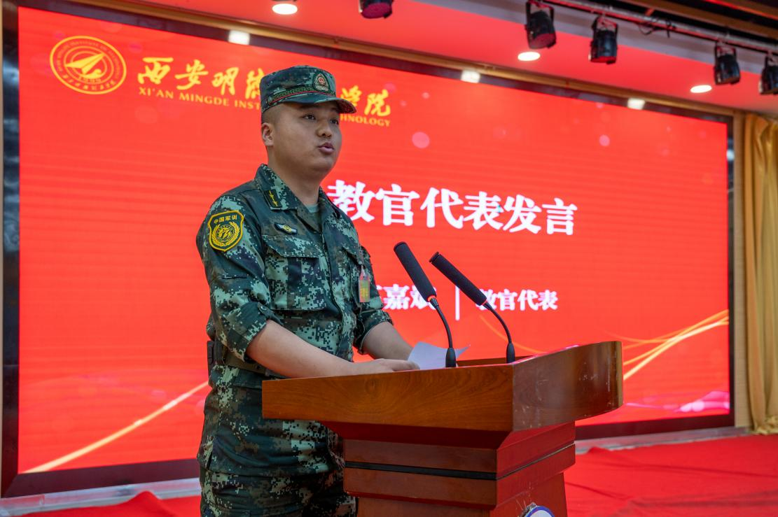 参训教官代表王嘉斌发言,表示坚持科学施训,文明带兵、以情带兵,以身作则,与同学共同圆满完成军训任务。