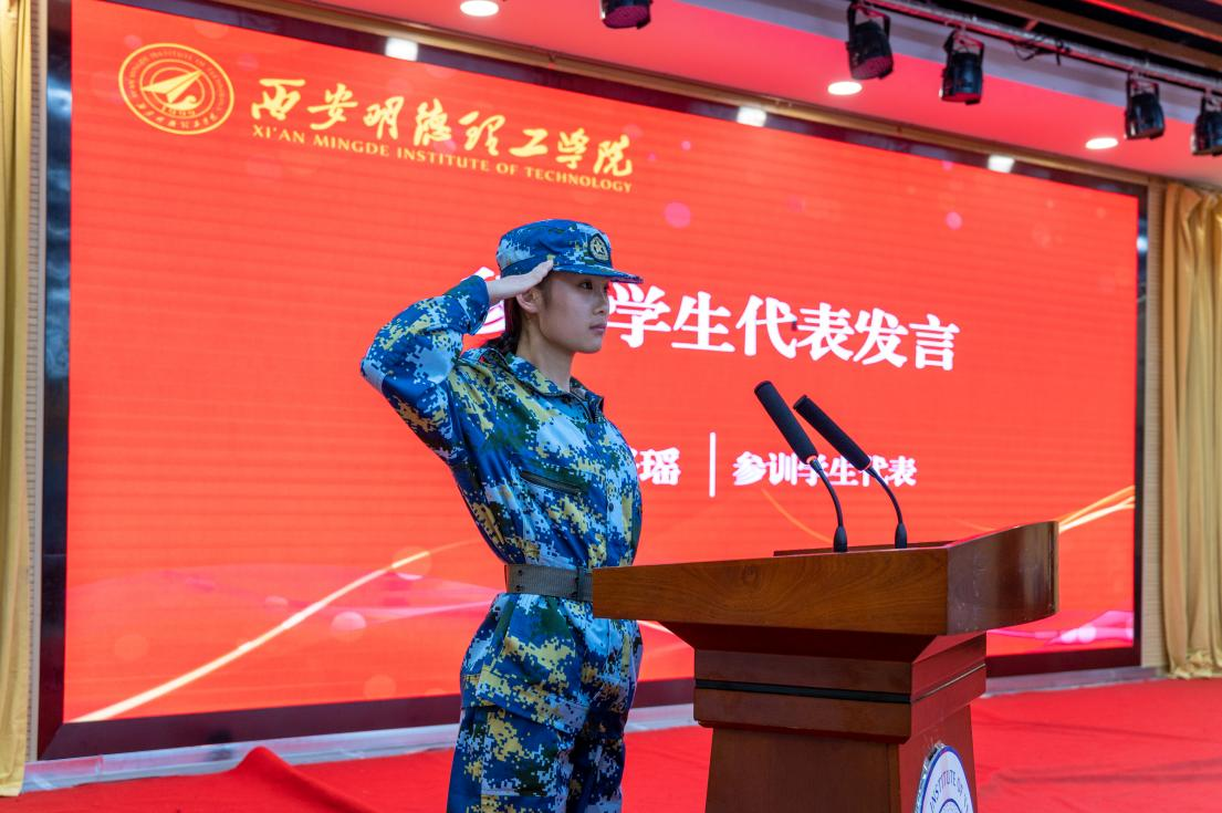 2022级学生代表王璐瑶发言,代表全体军训学员向各位教官、老师致以崇高敬意和衷心感谢,并承诺以饱满的精神迎接军训,做有担当、勇拼搏的明德学子。