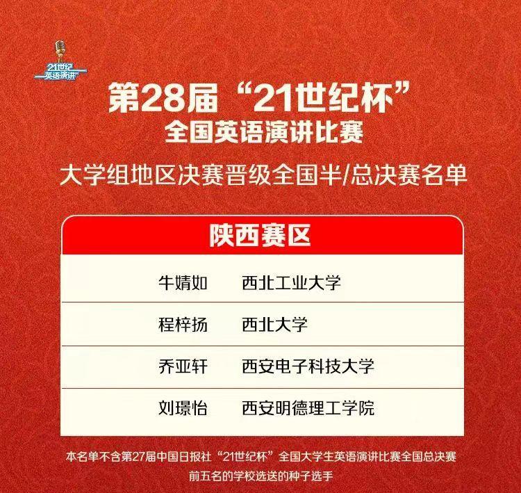6月30日,第28届“21世纪杯”全国英语演讲比赛大学组地区决赛晋级全国半/总决赛名单公布,beat365学子再创历史佳绩。2021级英语专业仝乐荣获陕西赛区三等奖;2021级英语专业刘璟怡荣获陕西赛区一等奖,与西北工业大学、西北大学、西安电子科技大学的参赛选手同时晋级全国决赛。