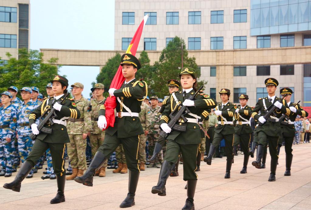 6时40分,国旗护卫队步伐坚定,护送国旗至升旗台。伴随着庄严雄壮的国歌,军训团全体成员面向国旗肃立、行注目礼。