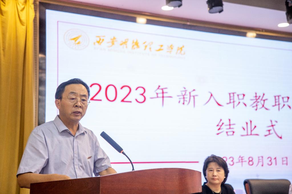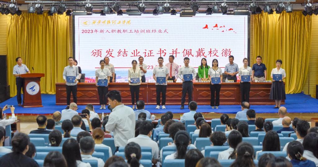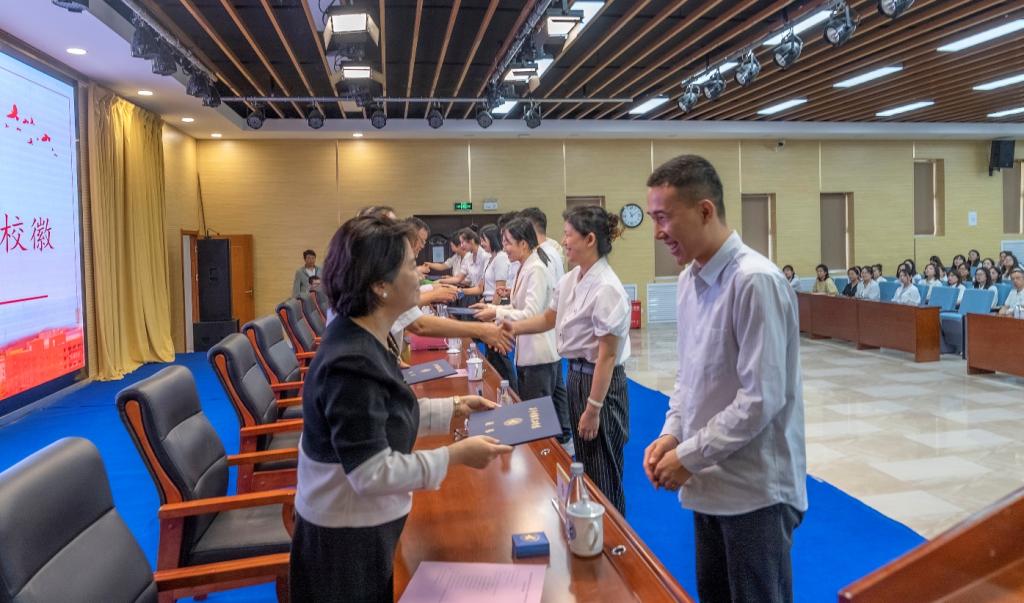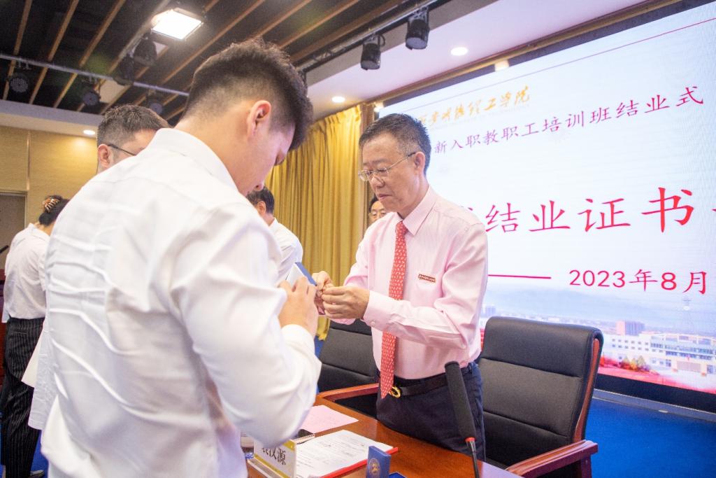 结业式在庄严的国歌声中正式开始。来自不同学院的8名新教师代表分享了学习心得。董事长袁汉源及参会领导为新教师颁发结业证书并佩戴校徽。