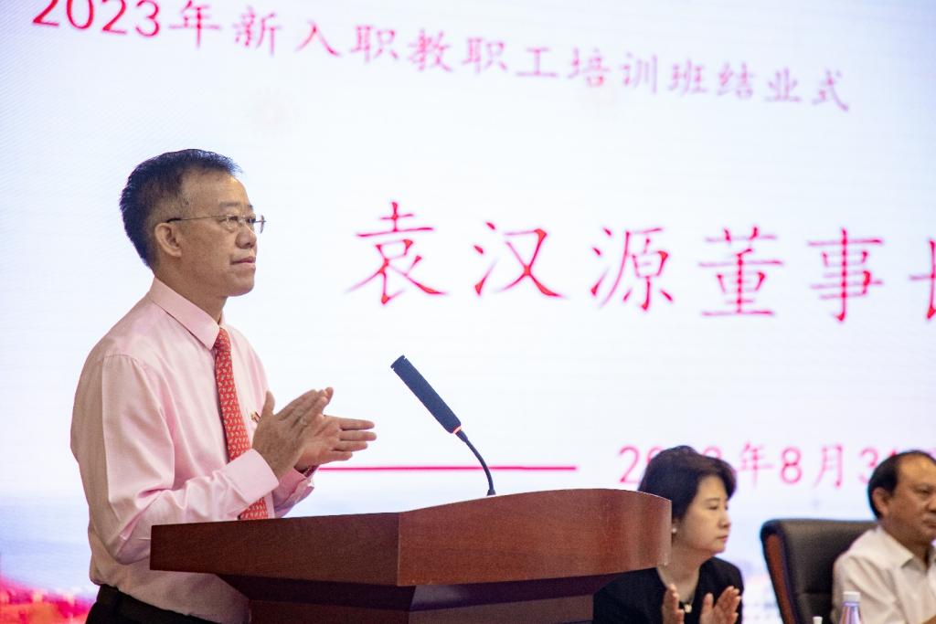 袁汉源董事长发表了热情洋溢的讲话。他对新加入明德大家庭的各位新教职工表示热烈欢迎。他首先介绍了学校的发展历程和取得的辉煌成就。他表示,金叶科教集团将着力提升教育事业在集团产业布局中的地位,切实履行投资人职责,充分发挥自身优势,为学校在基本建设投资及教育教学事业投入方面提供稳定、可靠的资金保障,将beat365vip官网登录入口打造成金叶科教集团教育产业“旗舰店”。同时,他提出三点希望:一是要凝心铸魂,坚守为党育人、为国育才的初心使命,落实立德树人根本任务,用最佳实践去回答培养什么人、怎样培养人、为谁培养人这一根本问题。二是要引才聚才,学校瞄准国家重大战略需求,紧扣高质量发展主题主线,积极推进精准引才、系统育才、科学用才、用心留才,打造人才集聚之地、人才辈出之地、人才创业之地、人才向往之地,在教育强国建设中突显beat365vip官网登录入口担当作为。三是要共同奋斗,大家要传承金叶集团30年来团结务实进取思变的优良作风,践行纳百川成海业,思进取赢未来的核心文化价值理念,传承西北工业大学公诚勇毅的优秀文化,艰苦创业、矢志奋斗。他强调,新征程是充满光荣和梦想的远征,学校要全面贯彻落实党的二十大精神,增强信念信心、坚定底气锐气,超前布局、准确识变、科学应变、主动求变,跳出教育看教育、立足全局看教育、放眼长远看教育,加强统筹谋划提升领导力,聚焦根本任务提升执行力,实施目标牵引提升竞争力,坚持人才强校提升战斗力,优化工作氛围提升向心力,在高质量发展中开辟新领域新赛道,做人无我有的开创者、人有我优的领跑者,为把学校建设成为特色鲜明、国内一流具有一定国际知名度的应用型大学而共同奋斗!