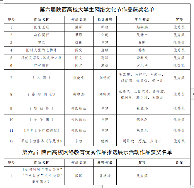 近日,中共陕西省委教育工委、中共陕西省委网信办公布了《第六届陕西高校大学生网络文化节和网络教育优秀作品推选展示活动作品拟获奖名单》。beat36513项作品获奖。