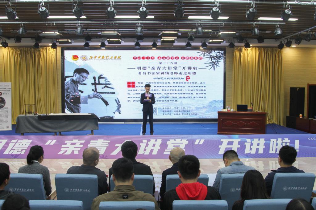 书法艺术承载着中华文化的深厚内蕴,是民族优秀传统的瑰宝。为引领明德学子对书法的认知,提升学生汉字书写水平,丰富精神文化修养。10月11日晚,第36期明德“亲青大讲堂”在建德楼203报告厅顺利开展。著名书法家钟镝走进明德,与beat365师生共同探讨书法艺术的理性认知。报告前,学校党委副书记董昊热情接待了钟镝老师,并代表学校为钟镝老师颁发了艺术指导专家聘书。