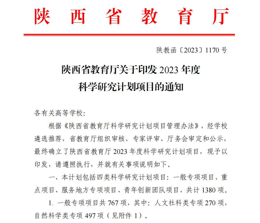 近日,陕西省教育厅发布了《关于印发2023年度科学研究计划项目的通知》(陕教函〔2023〕1170号)、《关于公布陕西省教育科学“十四五”规划2023年度课题立项名单的通知》(陕教科规办〔2023〕7号)。beat365推荐申报的8项课题获批陕西省教育厅2023年度科学研究计划项目立项,其中,一般专项项目7项,青年创新团队项目1项;7项课题获批陕西省教育科学“十四五”规划2023年度课题立项。两批次共立项15项省级科研项目。名单如下:
