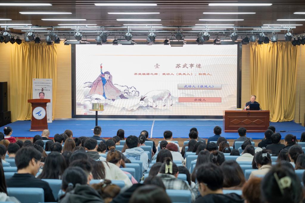 报告会上,苏振武教授以《苏武精神与道德价值》为主题,分别从苏武事迹、苏武人格风范与精神实质、苏武精神的文化传承与贡献、苏武精神的历史影响和现代价值等四个方面,为在场师生解读了苏武不凡的一生。苏教授以宏大的视野讲述了苏武受汉武帝之命出使匈奴,而后受尽磨难,却宁死不屈、志向不变,令后人钦佩。报告会以鲜明独特的历史文化,刻画了苏武凄美气节与高大形象,印证了中华民族磅礴精神气概。苏教授讲到,苏武的爱国精神已经熔铸为中华民族的魂魄,苏武的民族气节已经撑起了中华民族的脊梁,苏武的名字已经成为中华爱国主义的道德符号。他指出苏武精神的实质就是爱国主义民族精神!经过两千多年的历史传承,苏武的事迹已经家喻户晓,已经形成了一种独特的苏武文化。