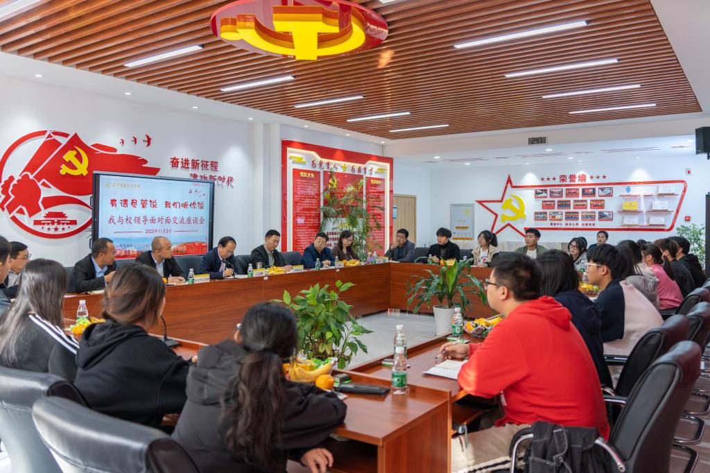 为进一步提升学校管理育人、服务育人的针对性与实效性,增强广大学生参与学校民主管理的主人翁意识,架起学校与学生常态化的沟通桥梁,倾听学生心声,解决学生问题,服务学生发展,11月3日下午,学校在明志楼北108会议室召开“有话尽管说,我们听你说——我与校领导面对面”学生座谈会。校长王志刚出席座谈会,学校办公室、党委学生工作部、教务处、后勤管理处、图书馆、校团委、网络信息化中心、明康医院等单位负责人及各学院学生代表参加会议,会议由学校办公室副主任刘书沛主持。