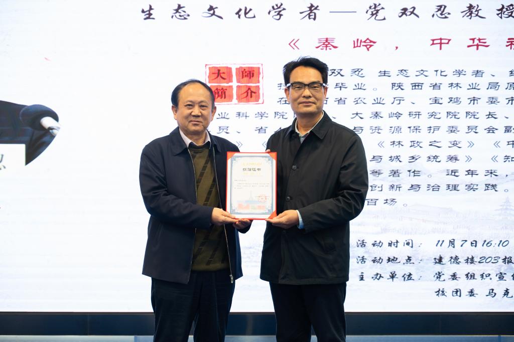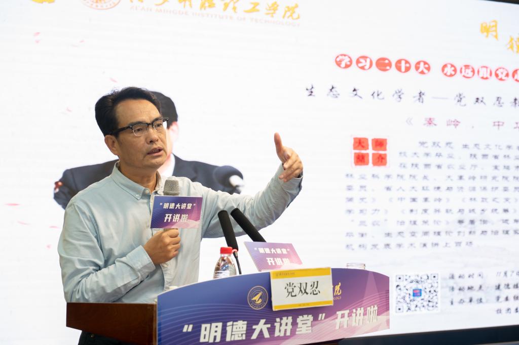 11月7号下午,第三十六期“明德大讲堂”在学校建德楼203报告厅举行,生态文化学者、经济学教授、陕西省林业局原局长、党组书记,省人大常委会委员、环资委副主任委员党双忍教授作客明德,带来主题为《秦岭:中华祖脉》的报告。