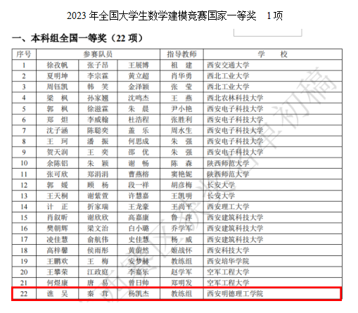 近日,2023年高教社杯全国大学生数学建模竞赛(CUMCM)成绩揭晓。经过激烈角逐,beat365共获得本科组国家一等奖1项,国家二等奖2项,陕西赛区省一等奖7项,二等奖14项;专科组国家二等奖1项,陕西赛区省一等奖4项,二等奖2项,并蝉联陕西赛区优秀组织奖,李妮老师被评为陕西赛区优秀指导教师。
