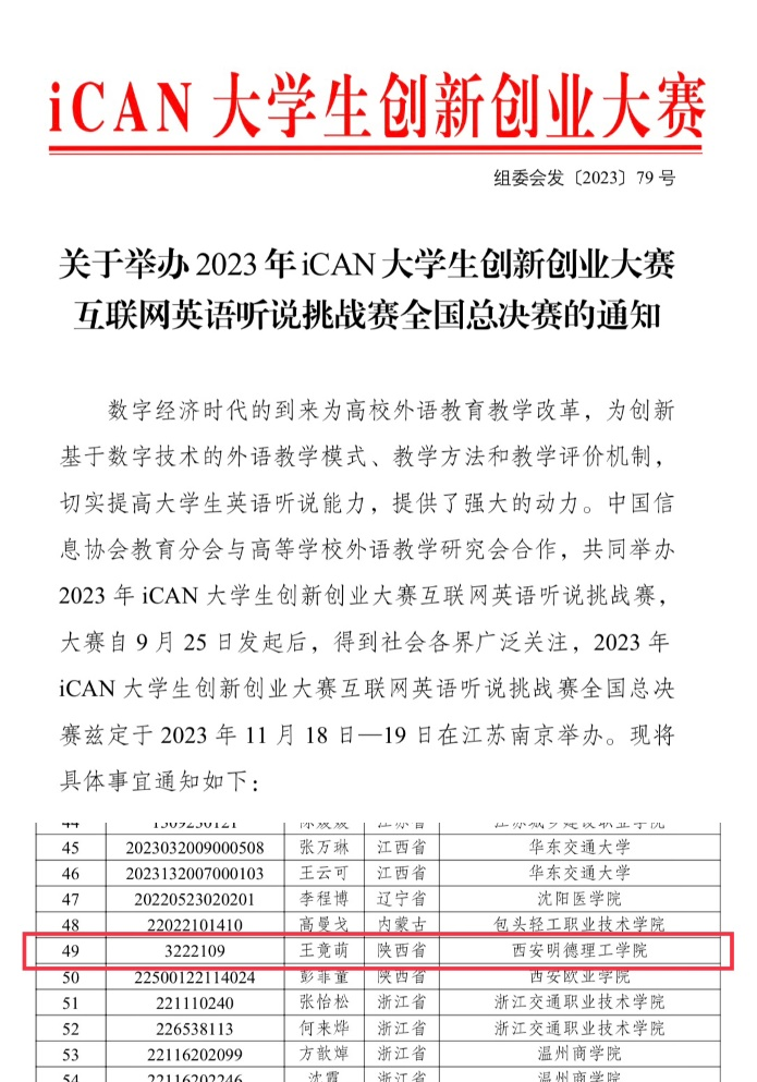 近期,2023年iCAN大学生创新创业大赛互联网英语听说挑战赛省赛圆满落幕,高等职业技术学院学生王竟萌获得全国总决赛参赛资格,并预赴江苏省南京市东南大学参加国赛,学生王鑫宇获得省一等奖。