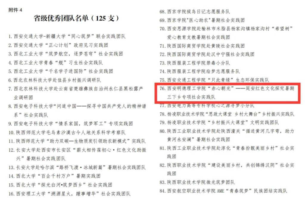 “赤心朝光”延安红色文化探究暑期“三下乡”专项社会实践队获得省级优秀团队。张啭啭等四位老师带领团队成员深入走进安塞人民的生活,感受大美安塞的红色文化。引导青年学生赓续红色基因、追溯红色记忆,深刻感悟青年时代的习近平在困境中自强不息、敢于吃苦、心系百姓、多干实事的精神品质。活动被新华社、中华网、华商网、西部网、西北信息报、今日头条、群众新闻、腾讯新闻、西北在线、西西新闻等20多家主流媒体和地方媒体宣传和报道30余次。
