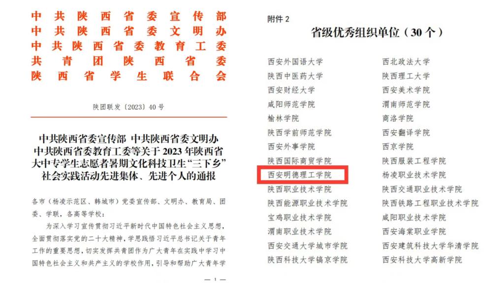 近日,中共陕西省委宣传部、中共陕西省委文明办、陕西省委教育工委、共青团陕西省委、陕西省学生联合会联合下发了《关于2023年陕西省大中专学生志愿者暑期文化科技卫生“三下乡”社会实践活动先进集体、先进个人的通报》,beat365荣获省级优秀组织单位称号,“七彩假期·情暖童心”心理疏导服务队荣获省级标兵团队称号,“赤心朝光”延安红色文化探究暑期三下乡专项社会实践队荣获省级优秀团队称号,教师张啭啭、兰艳荣获省级先进个人称号。