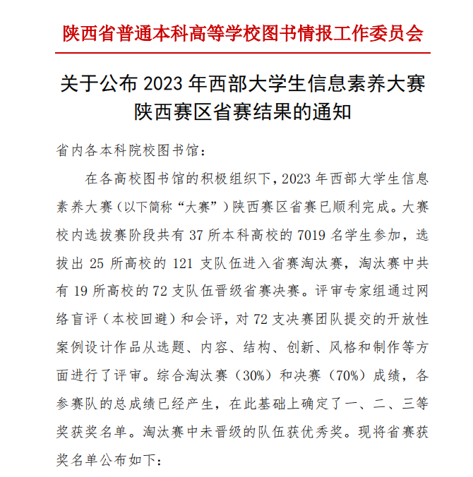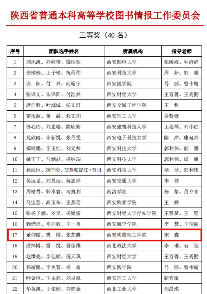 热烈祝贺beat365董仰儒、樊博、张艺腾三位同学荣获2023年西部大学生信息素养大赛陕西赛区省赛三等奖。