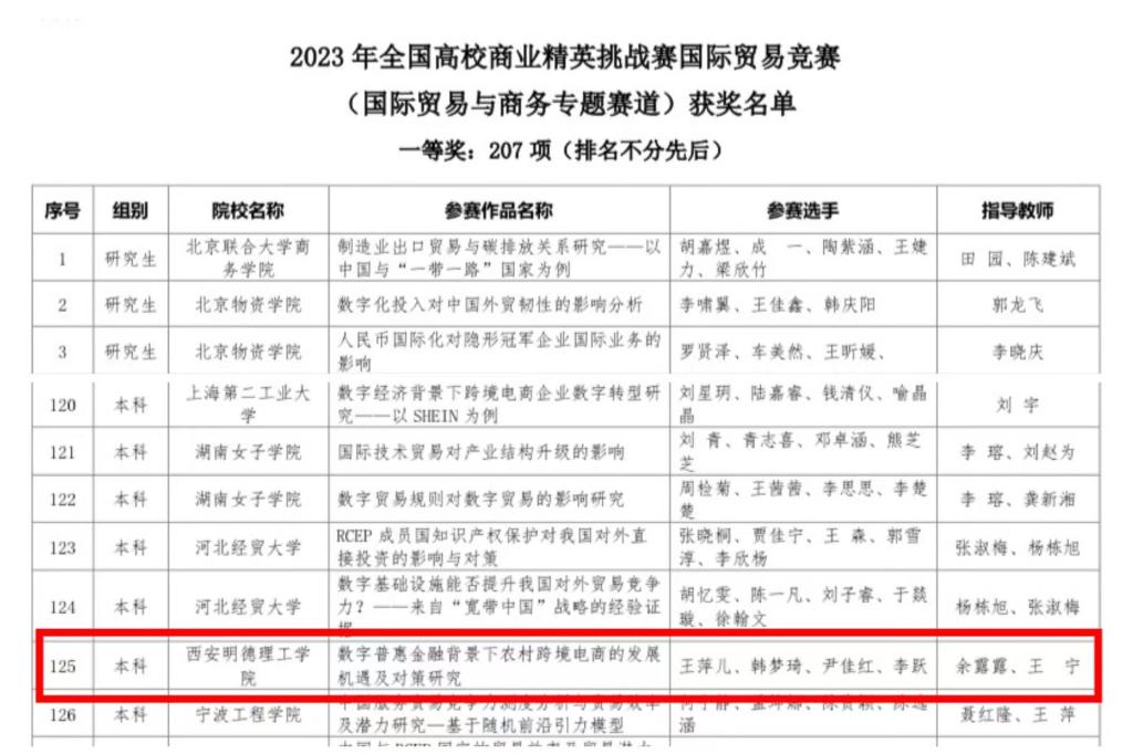 国际贸易与商务专题赛道主要面向国际经济与贸易专业或相关专业的研究生、本科学生和高职学生的理论研究型竞赛,通过论文写作方式,考察学生的理论功底、学科素养、写作水平、团队协作等能力。参赛团队结合当前国际经贸政策、国际财务金融、国际企业管理、国际营销和自由贸易协定应用等热点,选择其中一个主题,依据规定格式撰写一篇不少于2万字的应用研究型论文。经过专业教师地耐心指导、多次打磨修改,经济与管理学院学生王萍儿、韩梦琦、尹佳红和李跃的《数字普惠金融背景下农村跨境电商的发展机遇及对策研究》一文荣获一等奖。