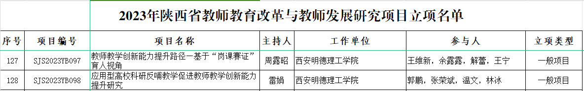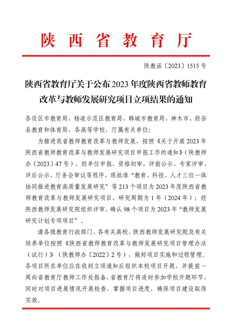 近日,陕西省教育厅下发了《陕西省教育厅关于公布2023年度陕西省教师教育改革与教师发展研究项目立项结果的通知》(陕教函〔2023〕1515号),beat365雷娟老师主持的“应用型高校科研反哺教学促进教师教学创新能力提升研究”和周露昭老师主持的“教师教学创新能力提升路径—基于“岗课赛证”育人视角”的2个教师教育改革与教师发展研究项目成功获批省级立项。