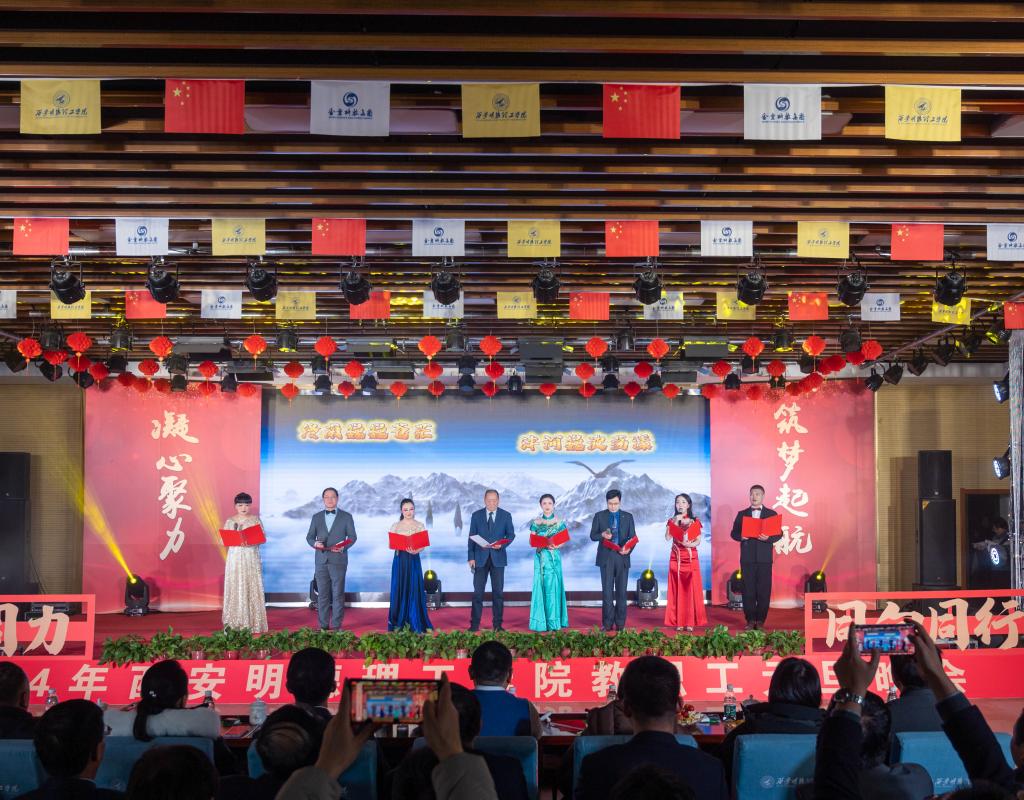 会上,学校董事长袁汉源发表了2024年新年致辞。他代表陕西金叶科教集团、明德源教育集团和学校董事会向广大师生员工致以诚挚问候和新年祝福。他指出,2023年是学校全面贯彻落实党的二十大精神,持续实施学校“十四五”事业规划。学校董事会、明德源教育集团和学校领导班子牢记为党育人,为国育才使命,以推动学校高质量转型发展打造区域特色的应用型,拼搏逐梦,凝心聚力,全力推动学校各项事业全面发展。金叶科教集团统筹指导和服务职能,切实把学校建设成为集团教育事业的标杆和“旗舰校”。今年以来,学校以励精图治、时不我待的责任担当,凝心聚力抓评建,开拓创新谋发展,为实现学校“十四五”时期的发展目标,为建设特色鲜明、国内一流,具有一定国际知名度的高水平应用型大学而努力奋斗!
