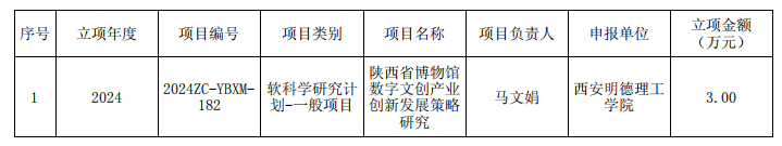 2014年1月18日,陕西省科技厅公布了2024年度陕西省科技计划项目立项结果,beat365艺术与设计学院教师马文娟申报的《陕西省博物馆数字文创产业创新发展策略研究》项目获2024年省级科技计划项目-创新能力支撑计划软科学研究计划项目立项。