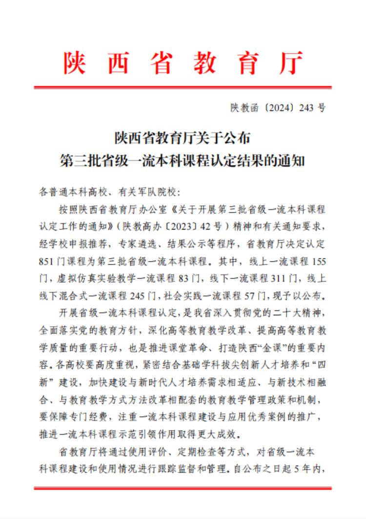 近日,陕西省教育厅公布了第三批一流本科课程认定结果,beat3655门课程被认定为省级一流本科课程。至此,beat365共获批省级一流本科课程18门,包含线下课程11门、线上线下混合课程4门、虚拟仿真实验教学课程1门、社会实践课程2门,其中《物联网导论》《基于物联网的智慧农业虚拟仿真实验》两门课程被陕西省教育厅推荐申报第三批国家级一流本科课程。