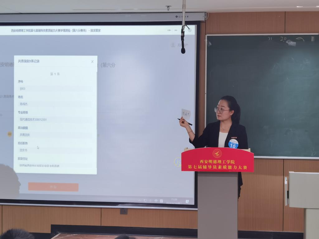 本环节比赛过程中,辅导员们精准识人,展现出扎实的基本功和良好的职业素养。学情熟知是辅导员的基本功,也是开展精准思政、应对突发事件的有力保障,只有了解学生在校生活、学习、工作、资助、奖惩等在校表现以及学生住宿情况和爱好特长才能有效提升思政工作的育人时效,确保安全底线。