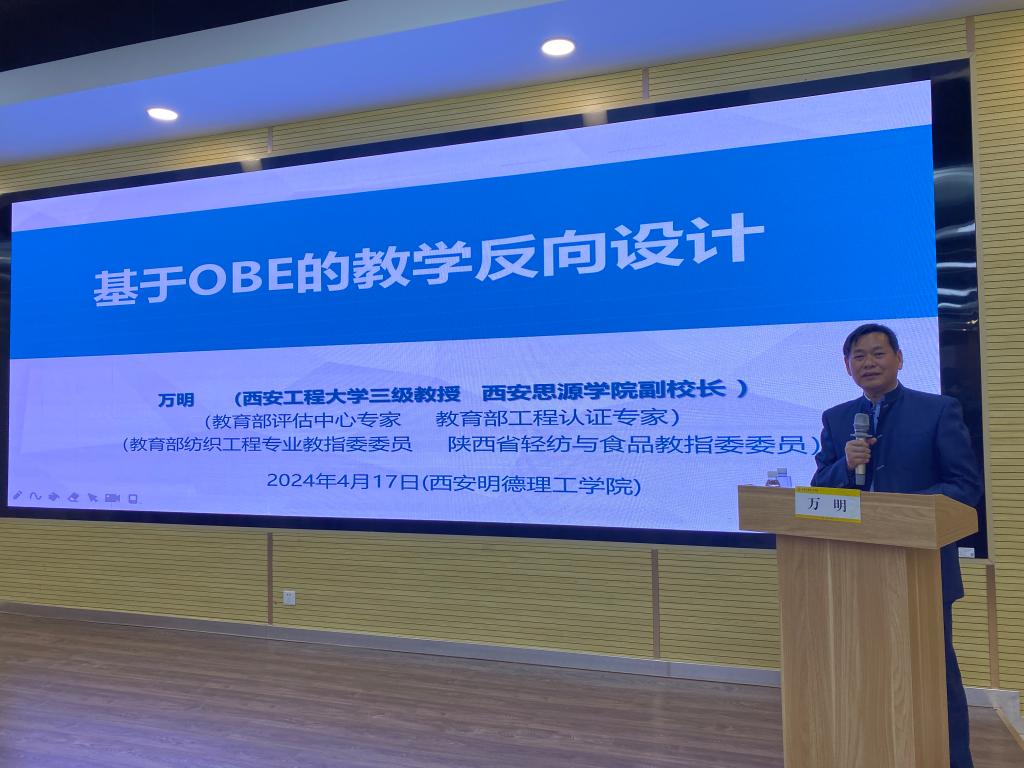 随后,万明教授做主题为《基于OBE的教学反向设计》的讲座。万明教授从四个方面进行讲解:第一,要不断深化OBE教学理念,以理念促改革,总结了“以评促建、以评促改、以评促管、评建结合、重在建设”的本科教育教学合格评估20字方针。第二,通过培养目标、毕业要求、课程要求和教学大纲四个方面对培养方案进行反向设计,进一步建立教学质量标准。第三,开展教学大纲反向设计,要做到大纲是产出的保障,课程是产出的载体,确保毕业要求达成是主线,守住产出评价机制底线。第四,推进课堂教学方向设计,是基于产出导向OBE,要求教师改变课堂,面对产出考核设计重点,详细阐述了教师应该如何考核检验学生能力的具体实施方法。