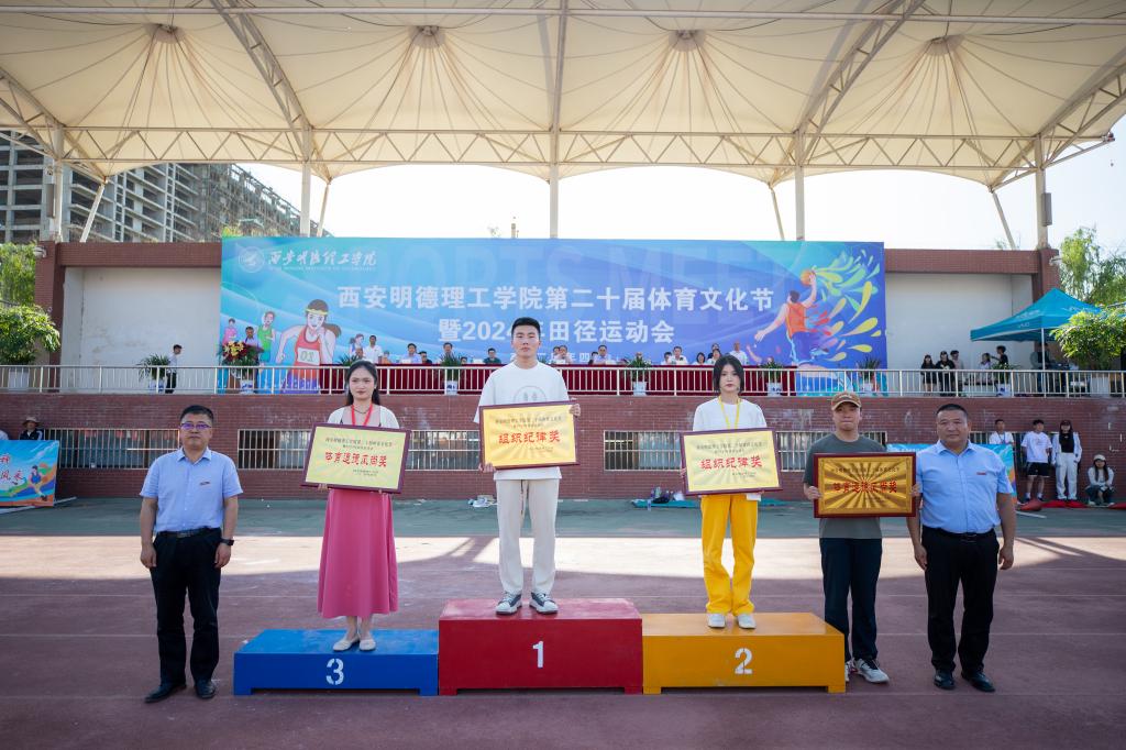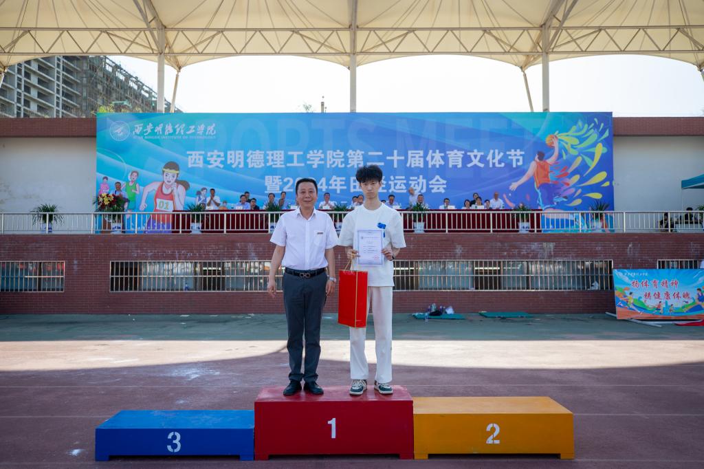 财务总监马晓军为来自智能制造与控制技术学院的打破本次运动会男子跳高校纪录的任剑宇同学颁发纪录奖。