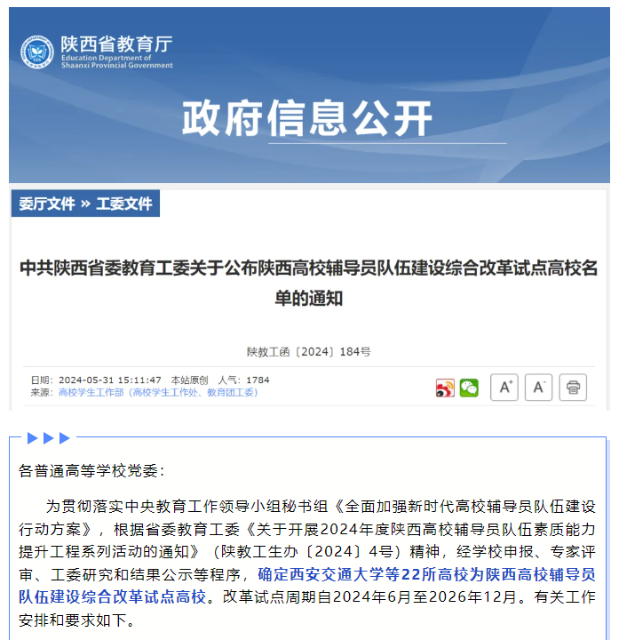 近日,中共陕西省委教育工委公布了《中共陕西省委教育工委关于公布陕西高校辅导员队伍建设综合改革试点高校名单的通知》,学校获批成为“陕西高校辅导员队伍建设综合改革试点高校”。这是beat365辅导员队伍建设工作取得的新突破。