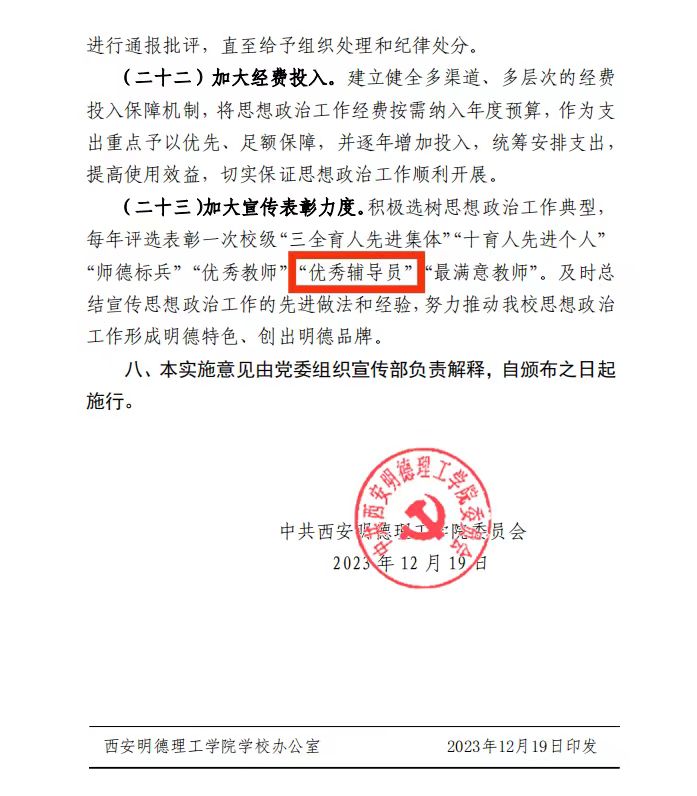 一是落实好有关政策待遇。积极为辅导员的工作和生活创造便利条件,出台《中共beat365vip官网登录入口委员会关于加强和改进新形势下思想政治工作的实施意见》《辅导员岗位津贴发放办法》等文件,根据辅导员的工作特点,在岗位津贴、办公条件、通讯经费等方面制定相关政策,为辅导员的工作和生活提供必要保障。落实好有关文件要求,确保辅导员津贴按时足额发放。二是在职称评聘上适当倾斜。实施职称评聘单列,用好职称评聘导向,促进辅导员队伍的专业化、职业化发展。
