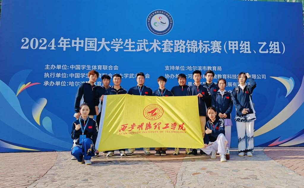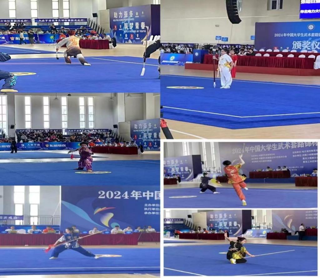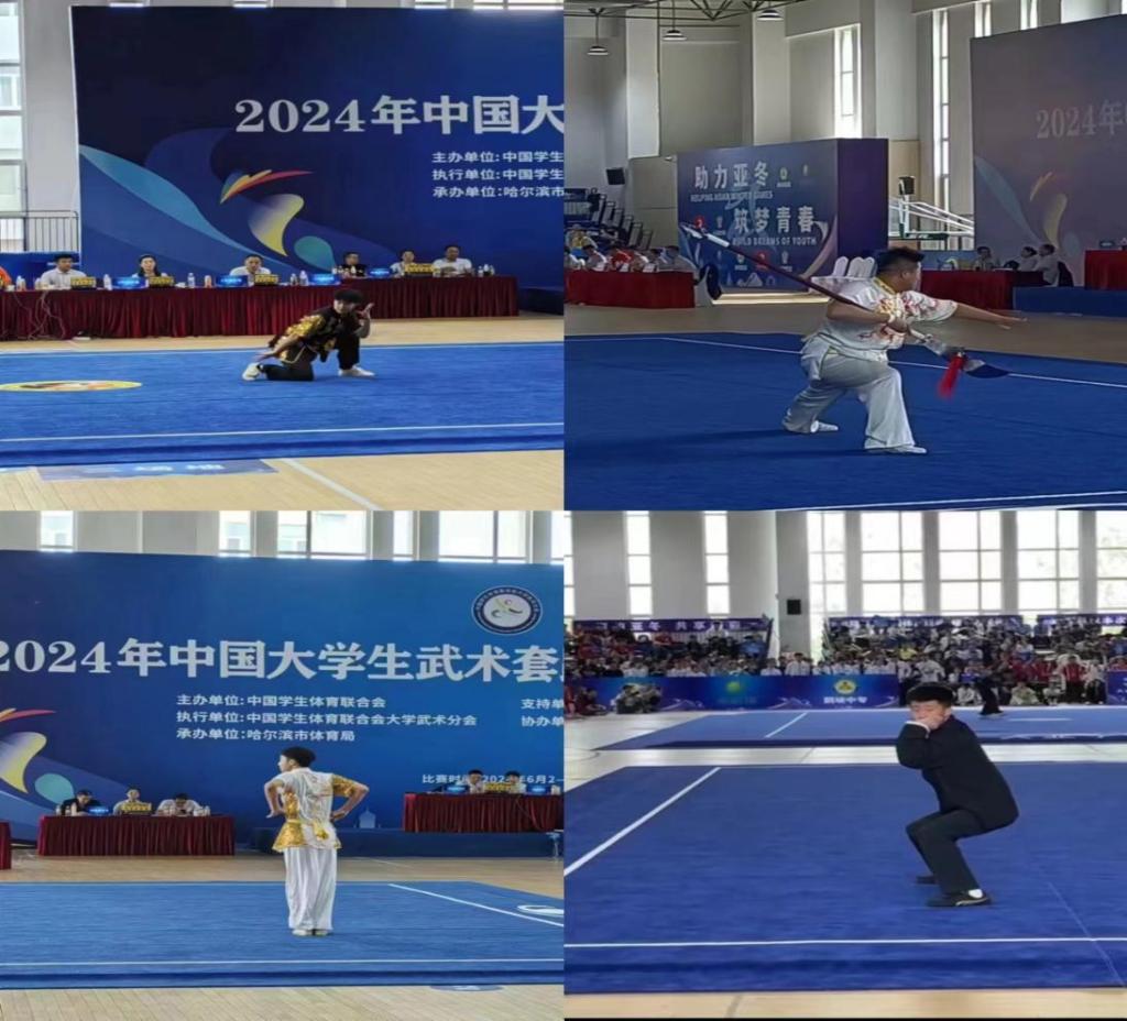 6月2日—6月9日,2024年中国大学生武术套路锦标赛在哈尔滨华德学院体育馆举行,来自全国的256支队伍2000余名运动员在这里上演一场“武林盛宴”。beat365通识教育学院体育教研室李鑫、孙鹏老师带领校武术训练队10名学生参加此次比赛。