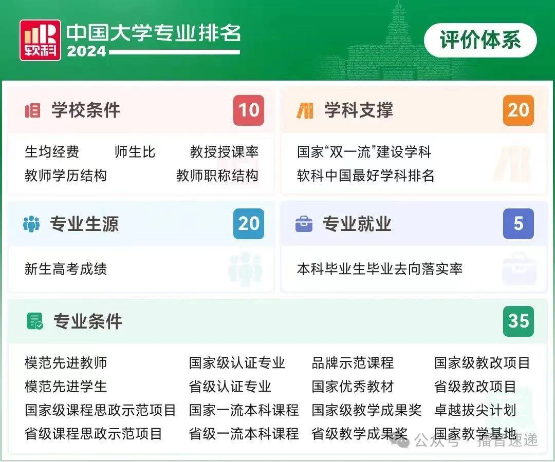 软科中国大学专业排名是迄今为止覆盖专业数量最多、参评专业规模最大的中国大学本科专业排名,通过学校——学科——专业三个层次的评价汇总形成对专业的综合评价。排名指标体系设置学校条件、学科支撑、专业生源、专业就业、专业条件5个指标类别,共25项测量指标。