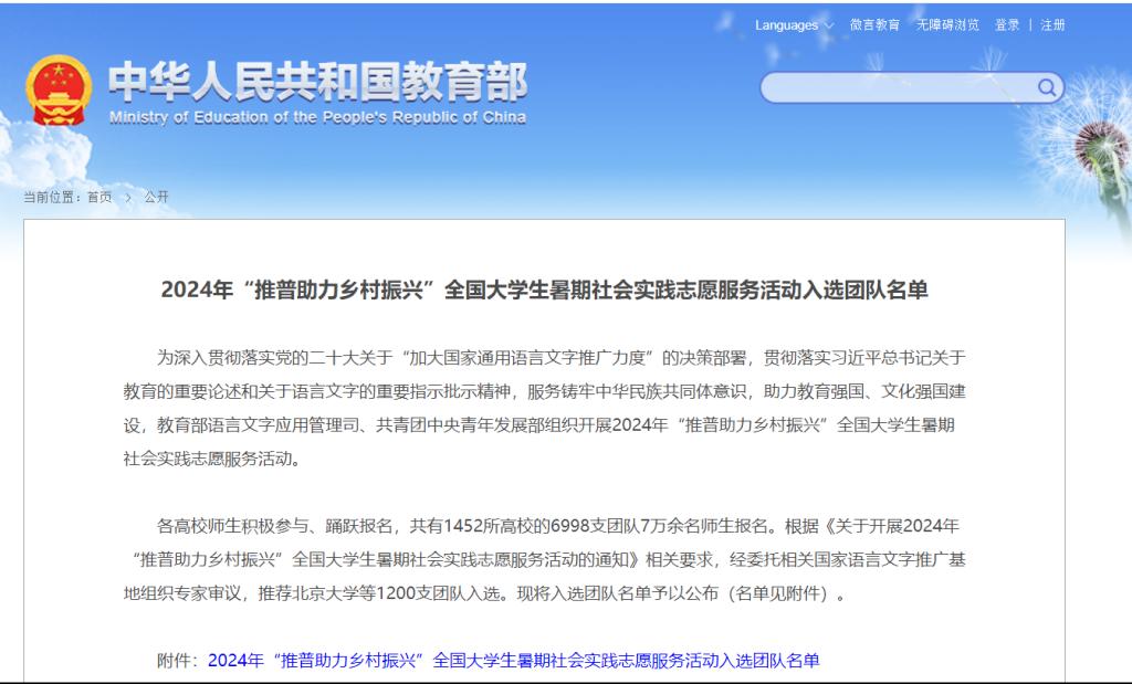 教育部2024年“推普助力乡村振兴”全国大学生暑期社会实践活动入选文件公示