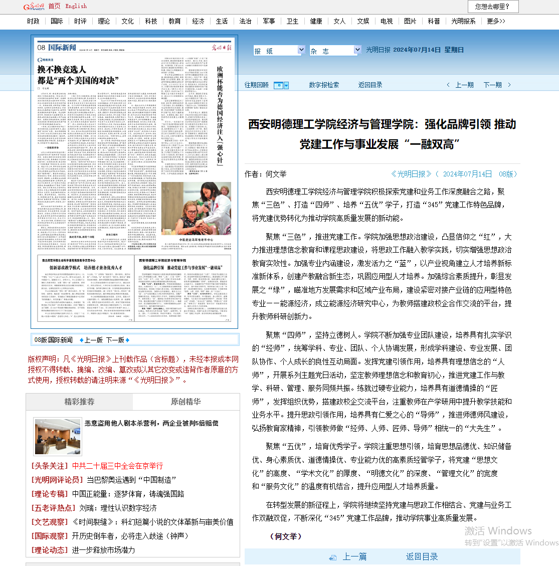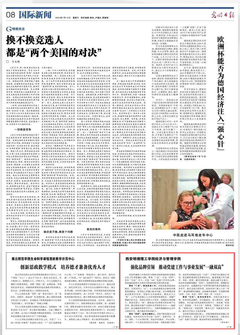 beat365vip官网登录入口经济与管理学院以高质量党建引领学院事业高质量发展,积极探索党建和业务工作深度融合之路,实现党建工作与中心工作同频共振。经过近两年的创建,经济与管理学院党委获批校级首批党建工作“标杆院系”创建培育单位,教师党支部获批陕西省第四批党建工作“样本支部”创建培育单位,两个学生支部获批校级党建工作“样本支部”创建培育单位。7月14日《光明日报》第八版“国际新闻”以《beat365vip官网登录入口经济与管理学院:强化品牌引领推动党建工作与事业发展“一融双高”》为题,报道了beat365经济与管理学院以党建引领,打造“345”党建工作特色品牌,将党建优势转化为推动学院高质量发展新动能。现将原文转载如下:
