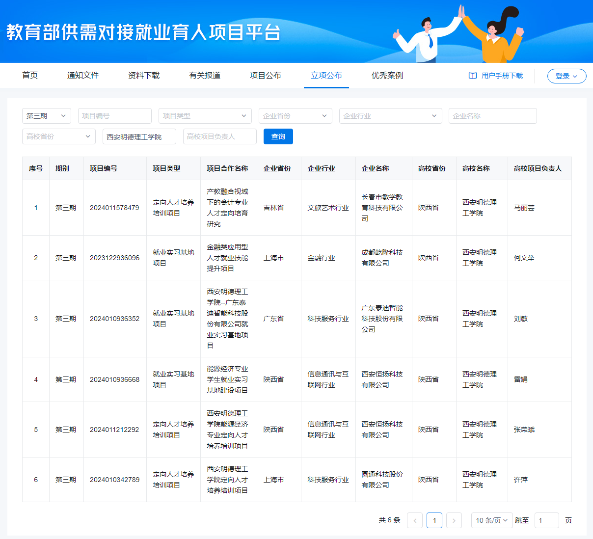 近日,教育部正式发布第三期供需对接就业育人项目立项名单,经济与管理学院与长春市敏学教育科技有限公司、成都乾隆科技有限公司、广东泰迪智能科技股份有限公司、西安恒扬科技有限公司和圆通科技股份有限公司等5家企业达成合作项目5个。实现学院产教融合、校企协同育人的新突破。