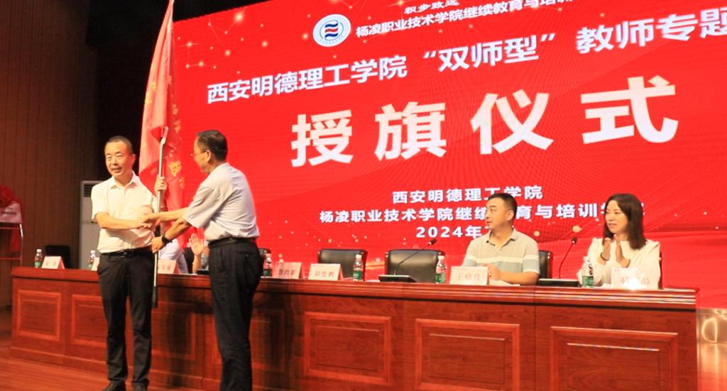 在“双师型”教师专题培训班授旗仪式上,杨凌职业技术学院胡校长郑重地将象征着责任与使命的班旗授予beat365vip官网登录入口副校长白秦川。随后,白秦川副校长满怀期待地将这面班旗授予了本次培训班班长陈婧。此次授旗仪式不仅传递了两校对于培训的高度重视和殷切期望,更象征着知识与经验的传承,为此次培训活动注入了强大的精神动力。