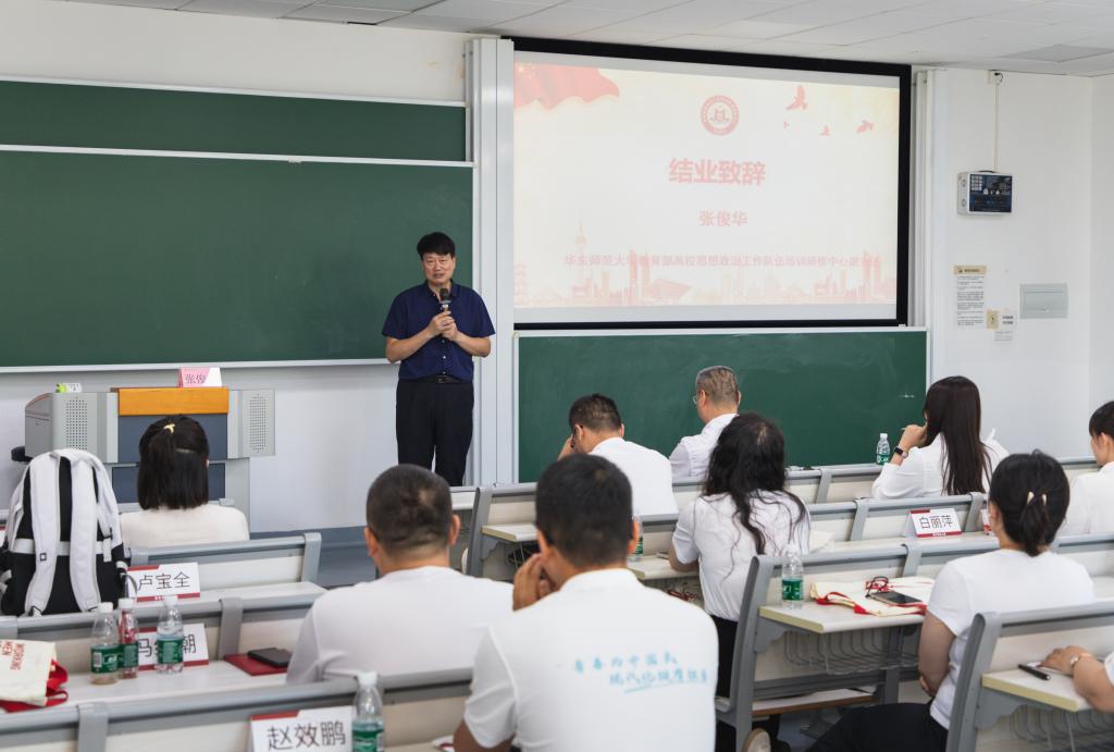 最后,华东师范大学教育部高校思想政治工作队伍培训研修中心副主任张俊华作结业致辞。他在总结讲话中对全体学员圆满完成学习任务表示祝贺,同时期望各位学员能够通过此次培训加强理论学习、提升政治站位、修炼政治品格和提升精神境界,坚定做好学生成长成才的陪伴者、引领者、守望者。