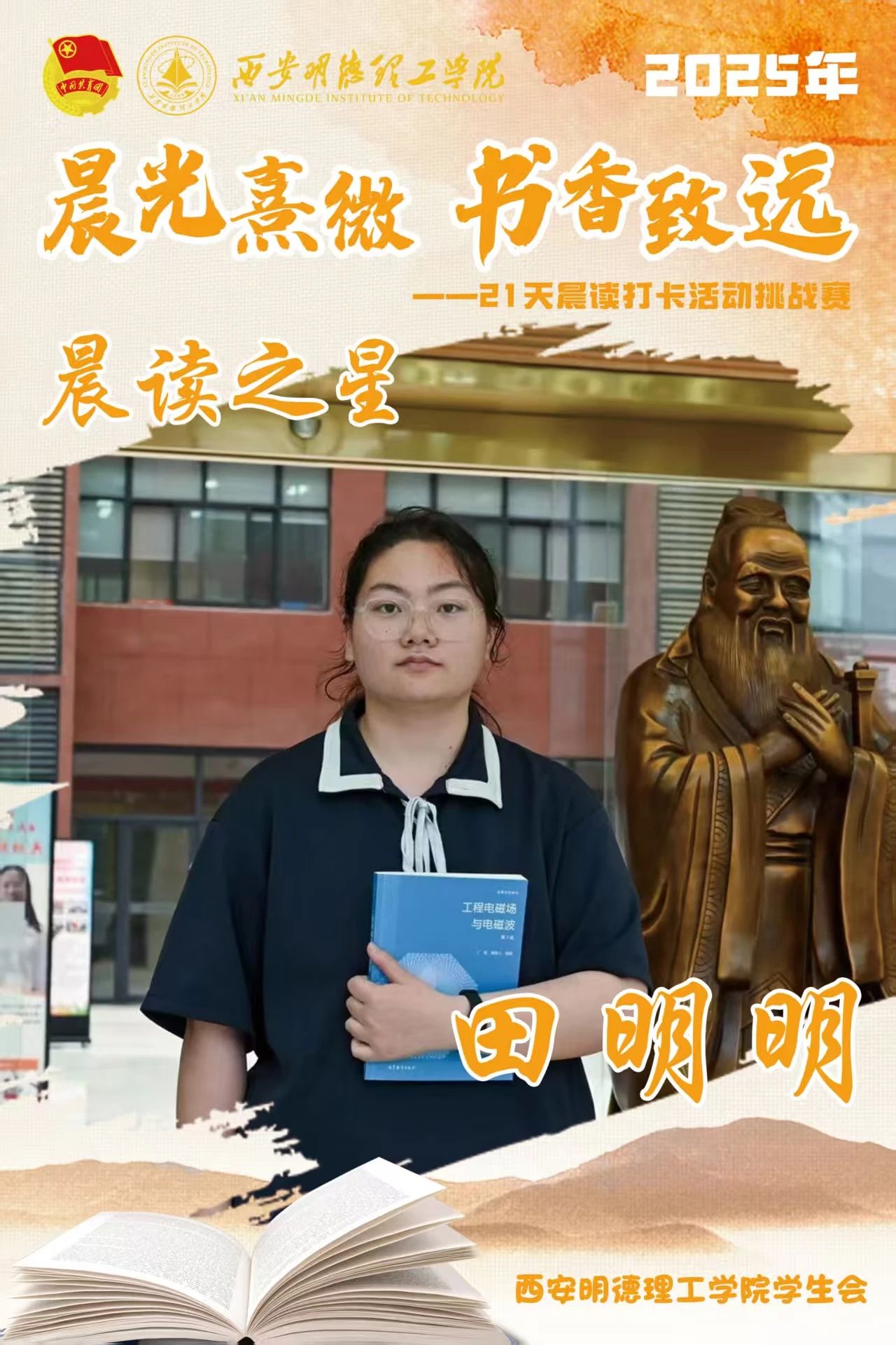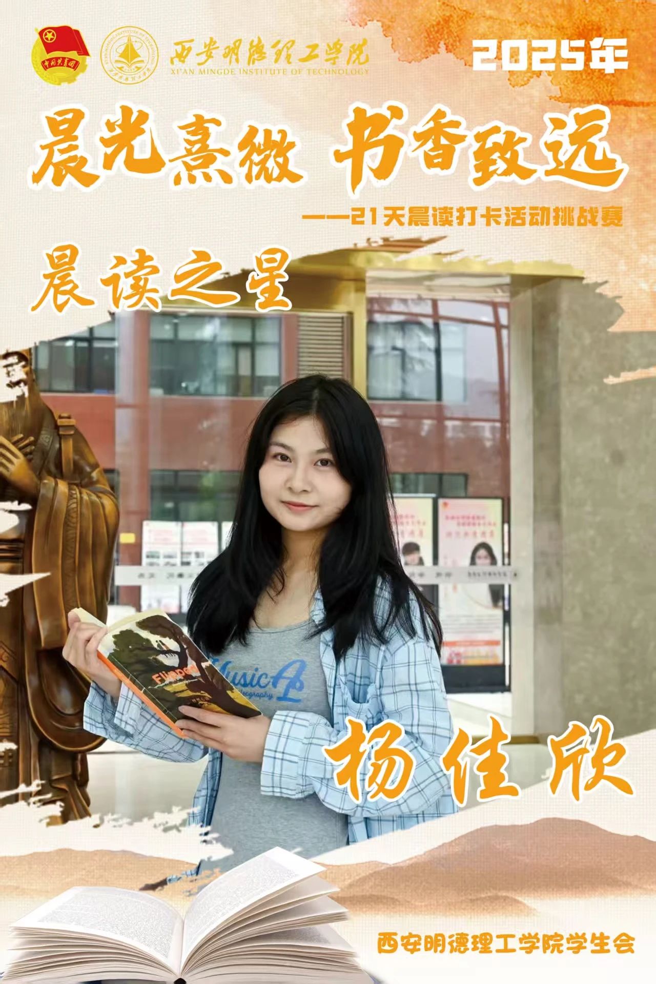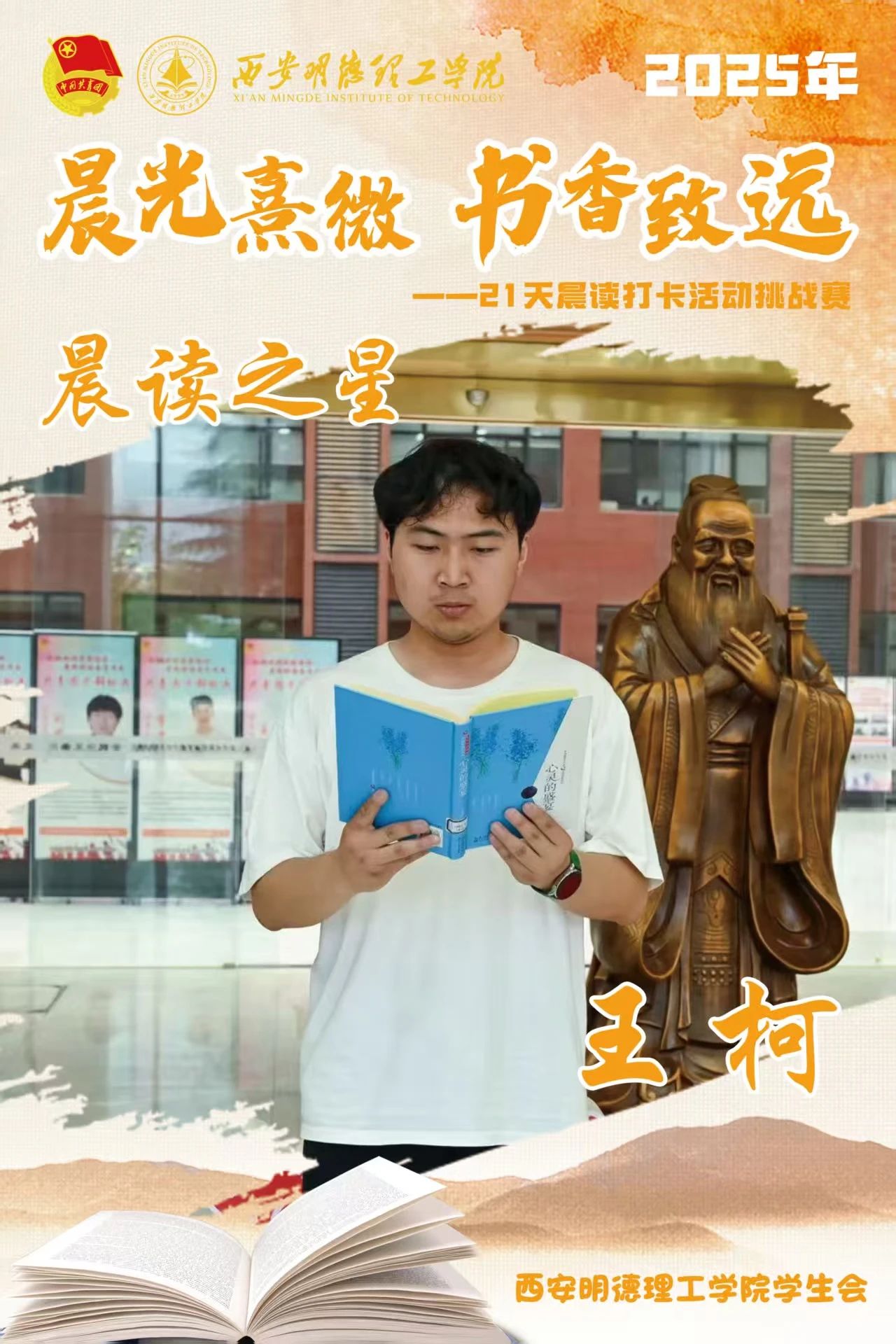 经过21天的坚持与努力,他们用行动诠释了坚持的力量,用毅力收获了知识与成长。随着活动落幕,晨读的余韵仍在校园蔓延,21天不是终点,而是终身学习的起点。愿明德学子以晨读为帆,在书香中继续丈量世界,让每一个清晨都成为追逐梦想的新起点。6月8日,让我们相约表彰大会,为坚持喝彩,为下一段书香征程蓄势启航!
