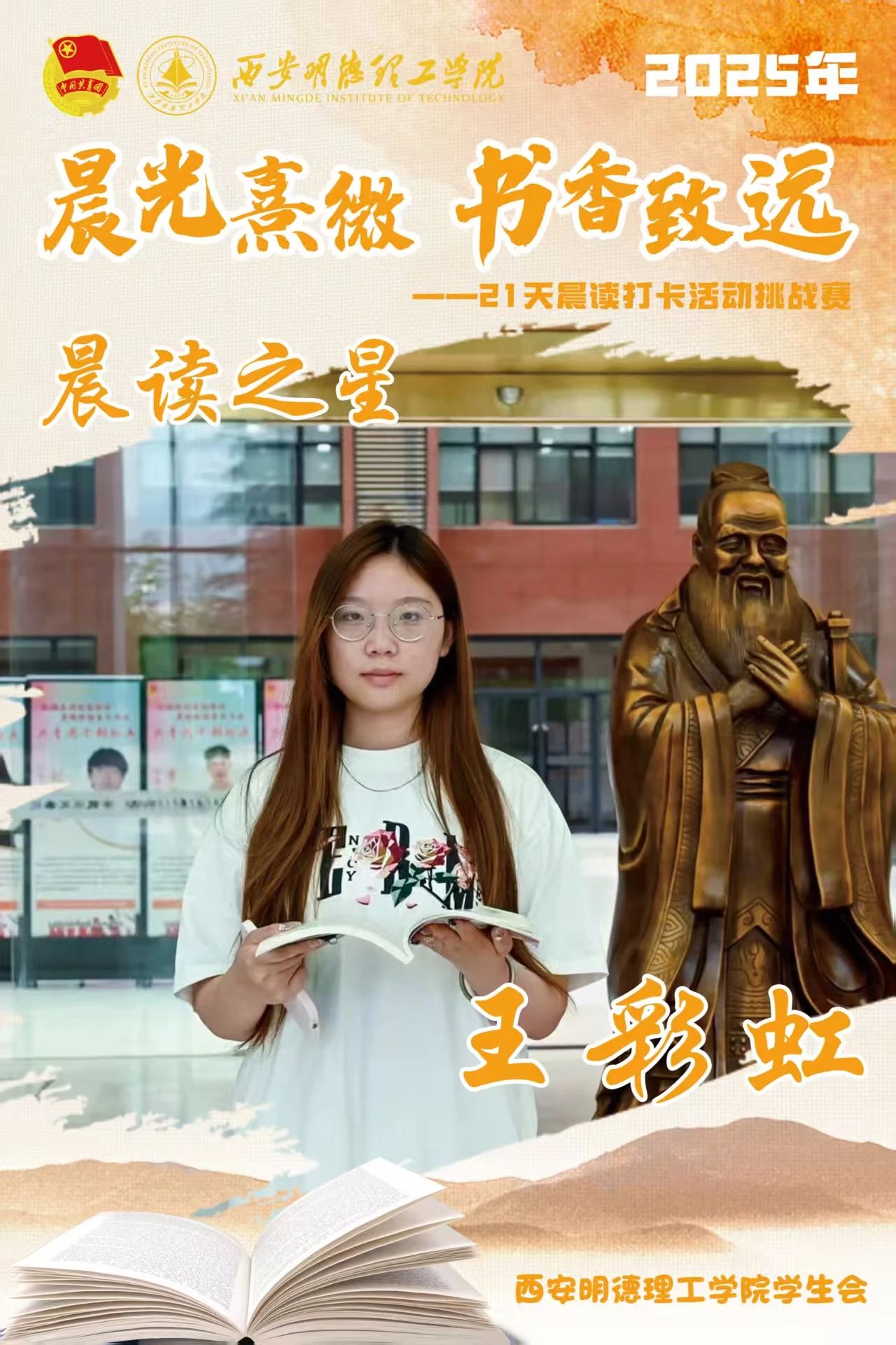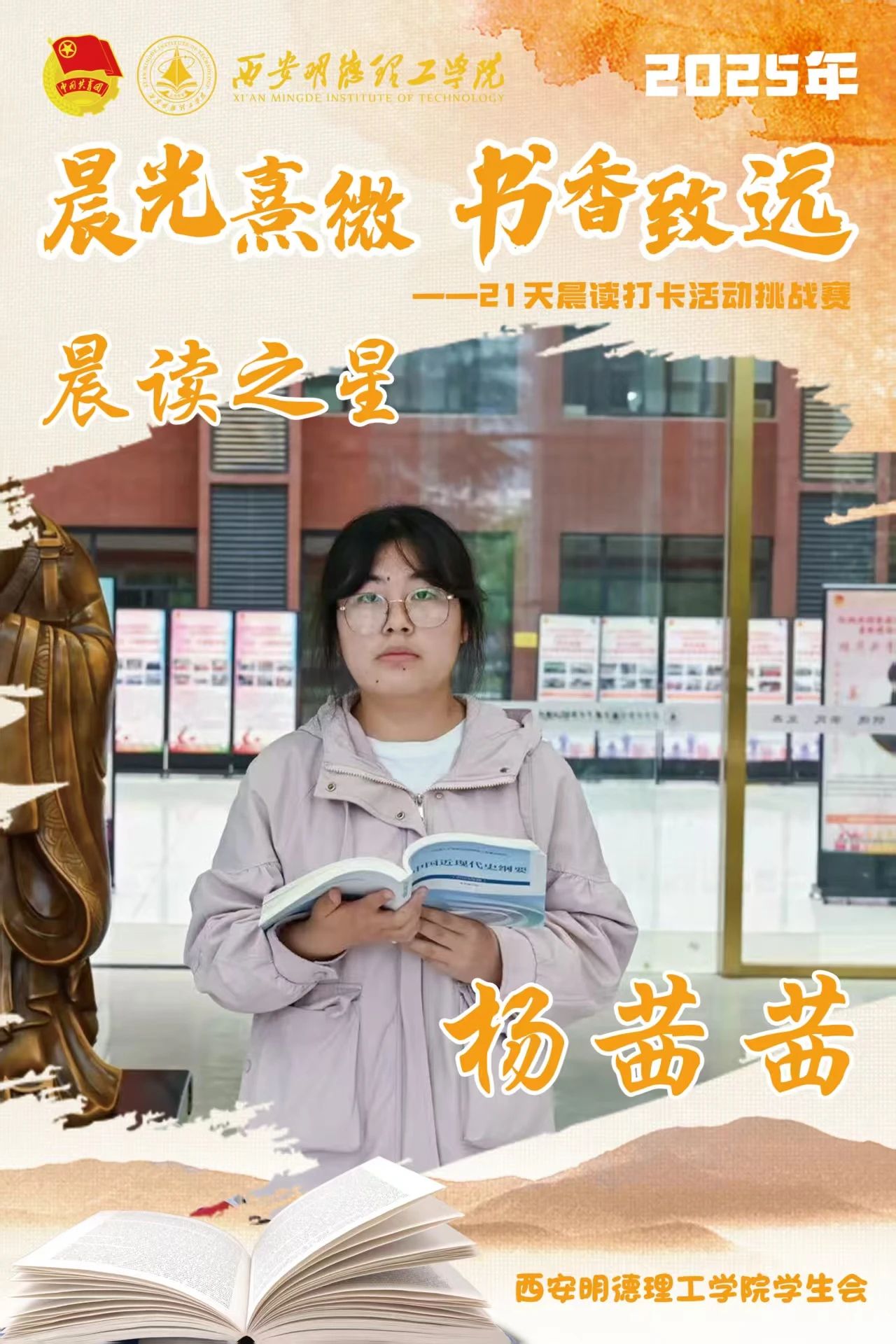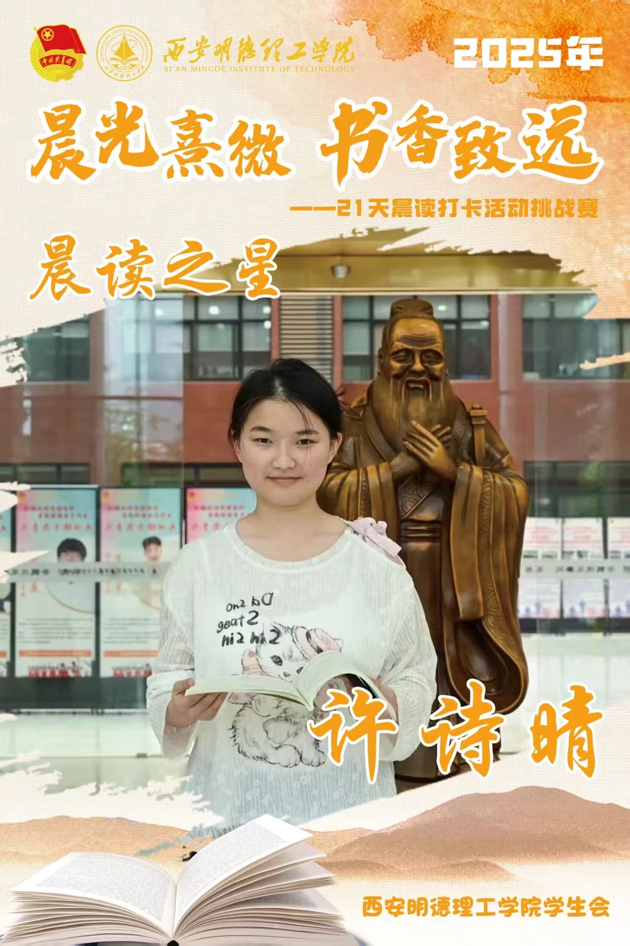 回顾21天的坚守,自律成为青春底色,每天清晨,下沉广场准时迎来晨读身影。有人捧着《论语》《诗经》,在古典诗词中感受文化底蕴;有人专注于英语四六级真题朗读,让标准发音唤醒清晨;更有同学带着专业教材,用公式推导与概念诵读开启学术思考。从春日微寒到柳絮纷飞,从初时的困意朦胧到后来的精神抖擞,同学们用行动诠释着“坚持”的力量。